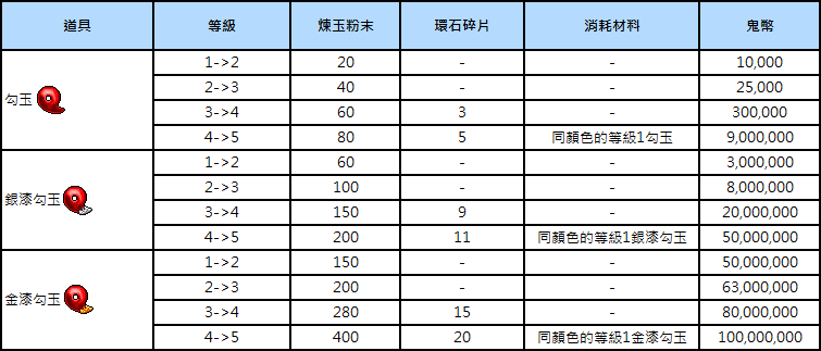 勾玉成長所需材料「煉玉粉末」、「環石碎片」、「鬼幣」以及同位階的勾玉。
